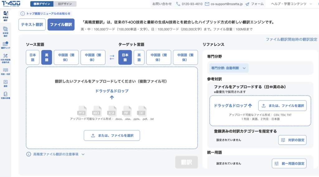 T-4OOの「ファイル翻訳」は、WordやPDFはもちろん、ExcelやPowerPointにも対応。翻訳したいファイルを選択するだけで準備は完了です。形式を選ばない柔軟性が、翻訳作業の入り口にある「心理的・時間的なハードル」を解消します。
