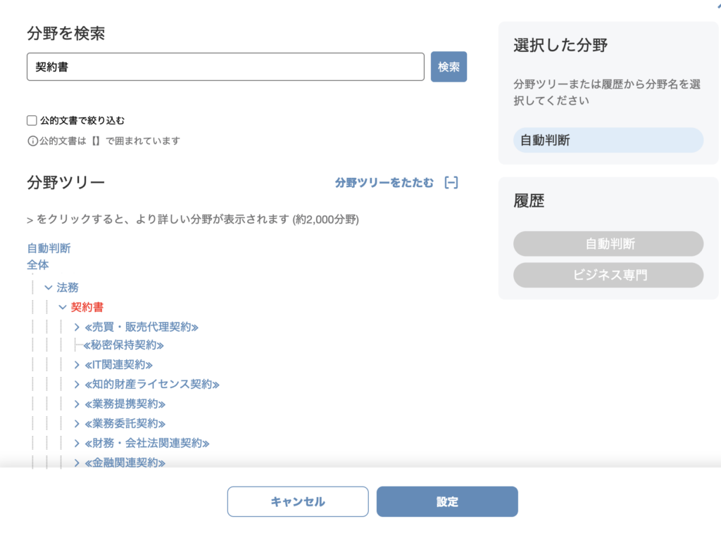 法務、医薬、機械、金融など、2,000におよぶ専門用語データベースを保有しています。 例えば、解釈の難しい「不可抗力条項」を含む文書なら、「契約書」分野を指定。これにより、AIはその業界特有の定型表現や法的ニュアンスをあらかじめ理解した状態で翻訳を開始します。この「専門性の指定」こそが、実務レベルの精度をぐっと引き上げます。