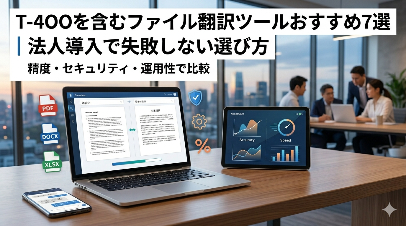 ファイル翻訳ツールは数多く存在しますが、法人利用では「精度」だけでなく「業務に組み込めるか」が重要な判断軸になります。特に契約書・技術資料・IR資料などは、翻訳品質とスピードの両立が求められます。本記事では、T-4OOを中心に主要ツールを比較し、実務で失敗しない選定ポイントを整理します。
