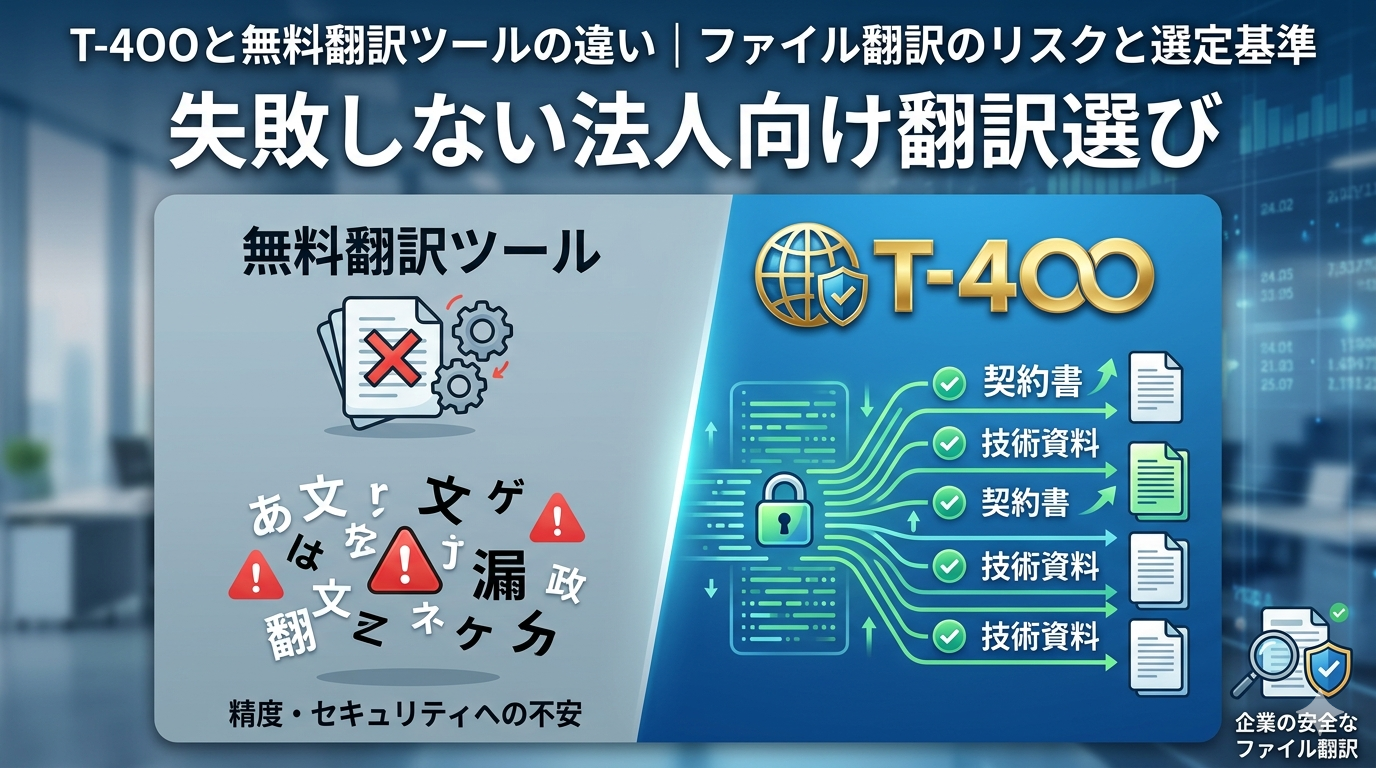 ファイル翻訳を行う際、多くの企業が無料ツールを活用しています。しかし、法人利用においては精度・セキュリティ・運用面で大きな差が存在します。本記事では、T-4OOと無料ツールを比較し、導入判断に必要な視点を整理します。
