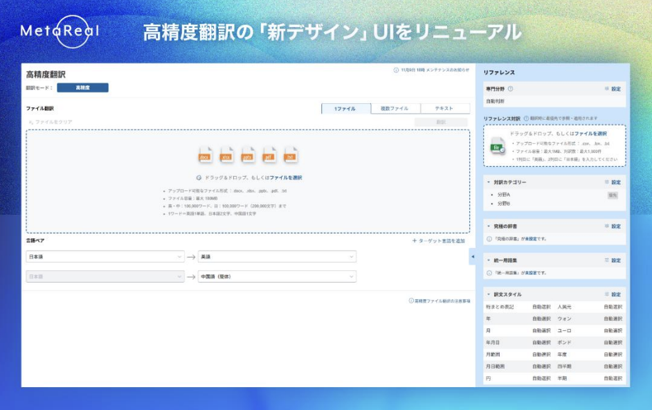 今回の新デザイン UI では、専門分野、対訳、用語集、訳文スタイルなどの各種リファレンス設定の視認性も大きく向上しています。