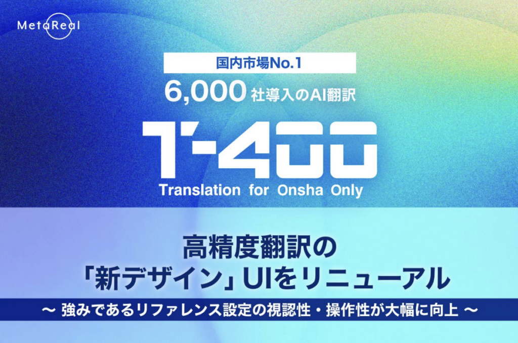 株式会社メタリアルグループで、国内市場 No.1*の AI 翻訳サービスを開発・提供する株式会社ロゼッタ(代表取締役:五石 順一)は、2026 年 1 月、高精度産業翻訳 AI「T-4OO(ティーフォーオーオー)」において、高精度翻訳(旧生成 AI 翻訳)機能の「新デザイン」UI をリニューアルしたことをお知らせします。