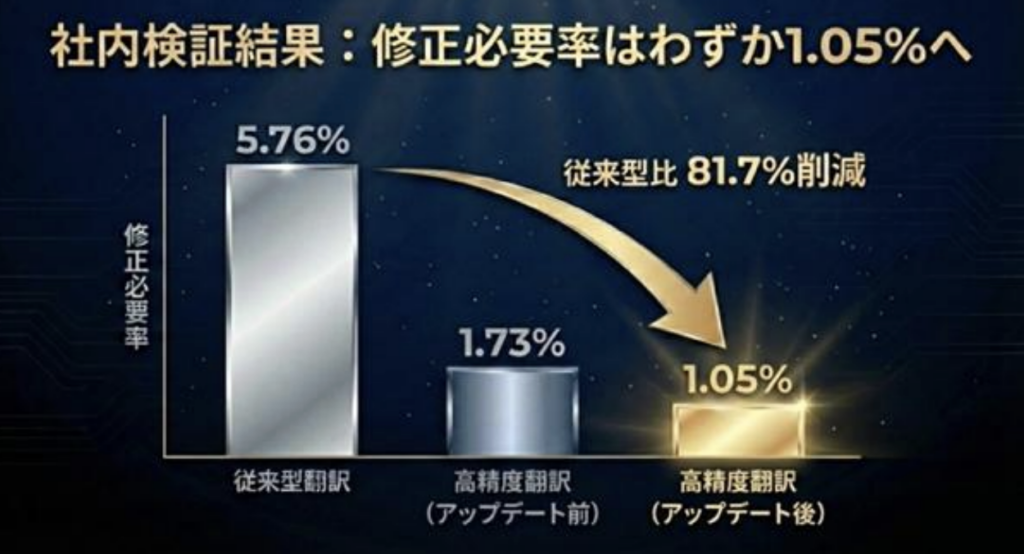 これにより、AI 翻訳後の人手による修正工数が大幅に削減できます。