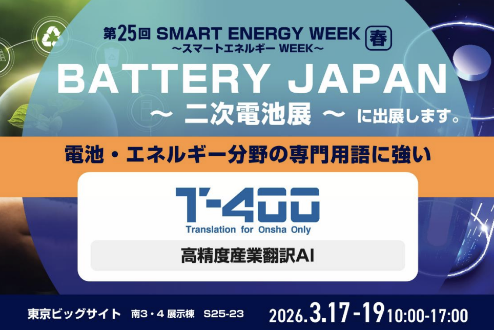 第25回 SMART ENERGY WEEK【春】『BATTERY JAPAN ~ 二次電池展 ~』高精度産業翻訳AI「T-4OO」、出展のお知らせ