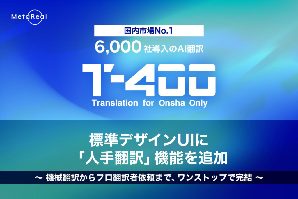 株式会社メタリアルグループで、国内市場No.1※のAI翻訳サービスを開発・提供する株式会社ロゼッタ(代表取締役:五石 順一)は、2026年3月13日、高精度産業翻訳AI「T-4OO(ティーフォーオーオー)」において、標準デザインUIに新たに「人手翻訳」機能を追加したことをお知らせします。